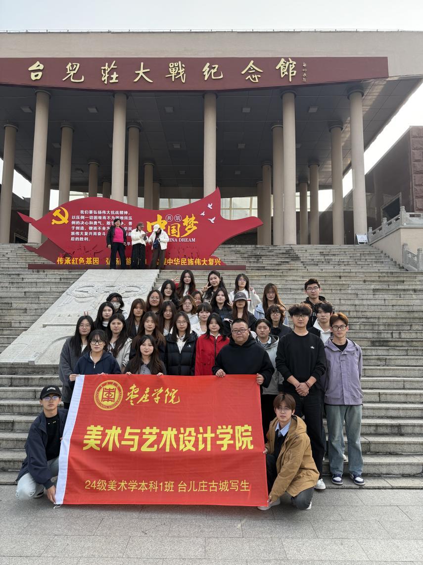 专业教学之余,为厚植员工爱国主义情怀、落实课程思政育人理念,带队教师组织员工走进台儿庄大战纪念馆,开展红色主题教育活动。同学们通过参观学习,详细了解了台儿庄大战的历史背景、战斗历程与重大意义,深刻认识到:作为美术专业员工,不仅要有过硬的绘画技能,更要以画笔为载体,传承红色基因、展现时代精神。将红色教育有机融入写生教学,是推进课程思政建设的重要实践,既助力员工提升专业素养,更引导其树立正确的世界观、人生观、价值观,着力培养兼具艺术才华与责任担当的新时代美术专业人才。