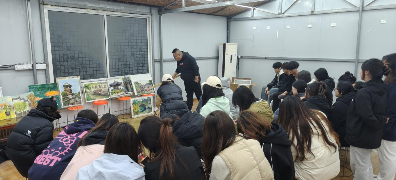 台儿庄古城兼具北方大院、徽派建筑、水乡风貌等多元建筑风格,古城内的街巷、桥梁、院落与运河景观相映成趣,构成了得天独厚的写生教学资源。写生期间,同学们携带画具、颜料等器材穿梭于古城街巷,将眼中的古朴韵味转化为笔下的绘画作品。教师团队结合美术学专业课程要求,围绕色彩风景写生的构图技巧、色彩搭配、艺术表现等核心要点开展指导与示范,每日组织员工对写生作品进行集中评讲,逐一点评作品的优点与不足,引导员工在交流研讨中提升审美认知与专业绘画能力。