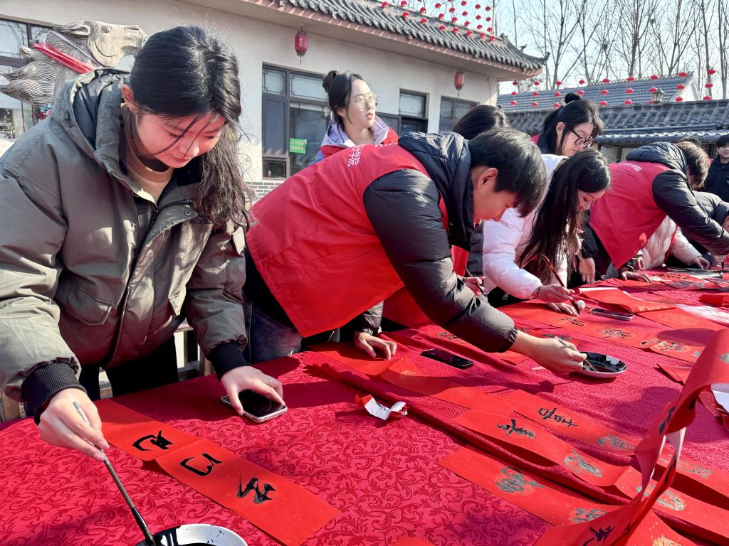 活动伊始,滕州市九龙湾乡村振兴示范区与悟空体育进行了“老员工社会实践基地“揭牌仪式,志愿者们参观了西岗镇九龙湾滑雪场、北赵景村融合区、水上乐园等,体验了乡村振兴建设的丰硕成果。随后,志愿者们挽袖执笔,饱蘸浓墨,随着笔锋的转动,一副副苍劲有力的新春对联、“福”字跃然纸上,志愿者们将心底的美好祝愿化作寓意平安和谐、吉祥如意的书法作品,书写出辞旧迎新的美好愿景。社区居民们围在桌旁,一边欣赏着书法创作,一边挑选着自己心仪的对联和福字,脸上洋溢着幸福的笑容。