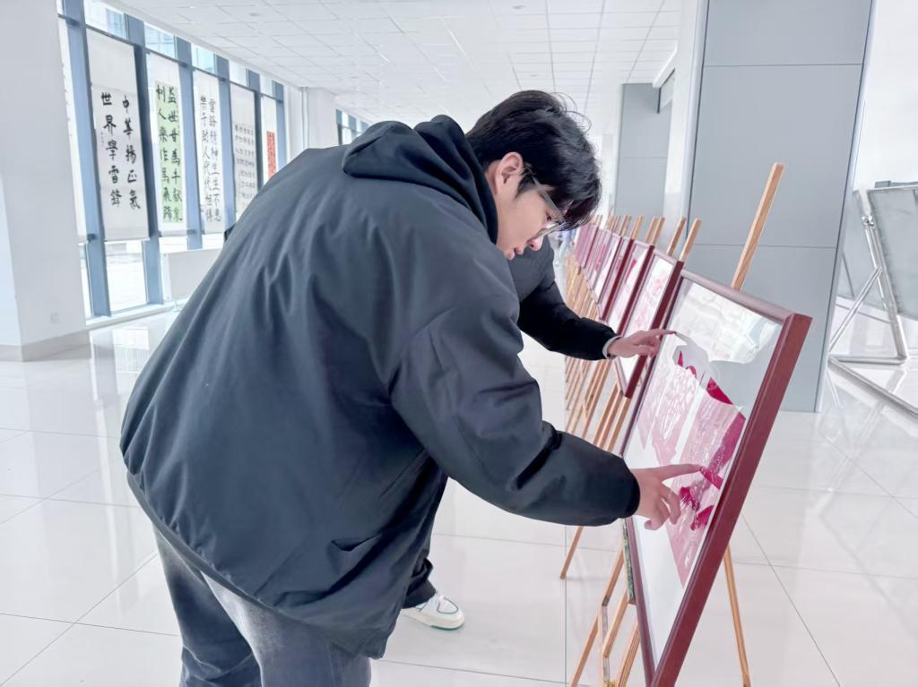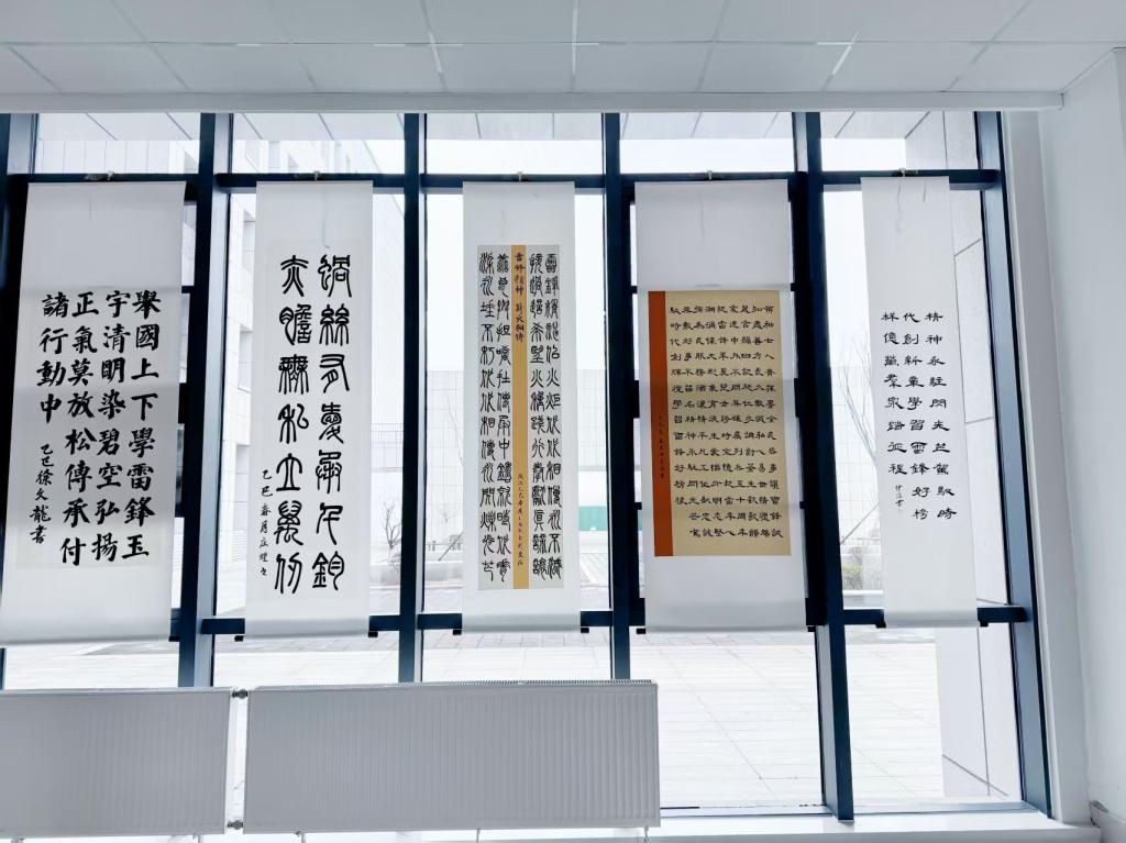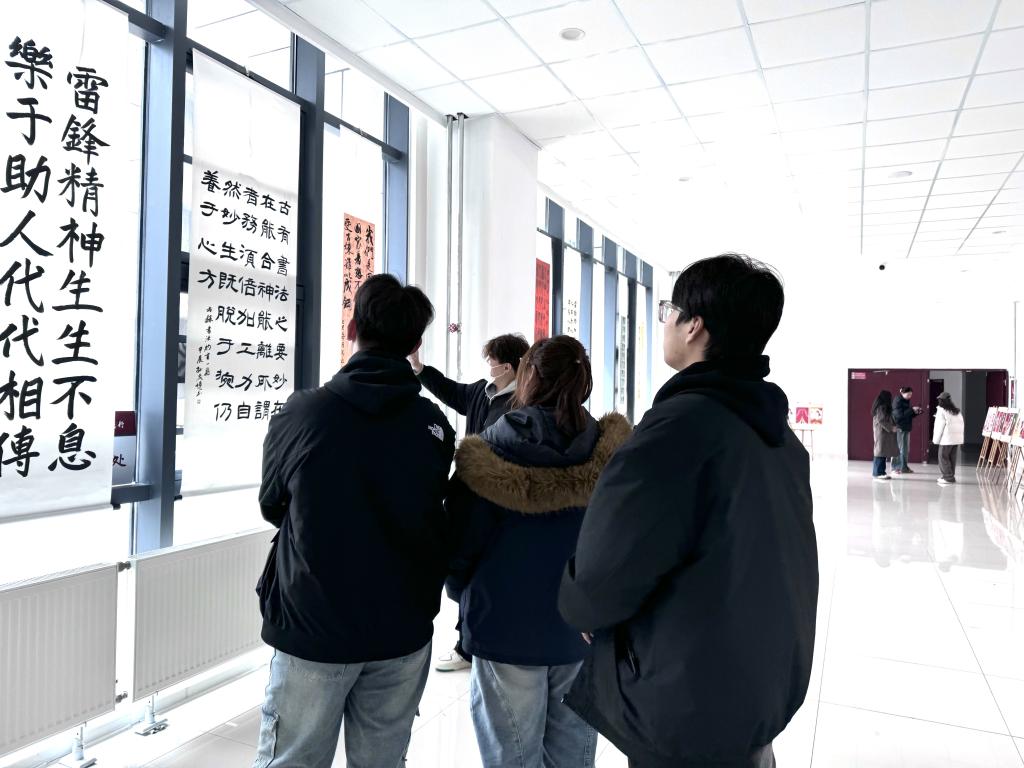 校党委副书记丰雷,枣庄市关工委副主任、校关工委常务副主任徐玲参观指导本次展览,员工工作处、离退休工作处、团委等部门负责人陪同。本次书画展共征集作品300件,展出作品80件。作品以雷锋形象、雷锋日记、雷锋语录为创作元素。展出作品风格多样、形式丰富,涵盖了绘画、书法、海报、剪纸等多种艺术形式,同学们以独特的视角和艺术手法展现了新时代老员工对雷锋精神的理解与传承。其中,书法作品创作中充分发挥“社团-指导教师-课程教学”的同向同行作用,将雷锋精神贯穿到书法课程中,在课程教学中融入雷锋精神,发挥了课程思政育人的效果,擦亮了雷锋精神传承。