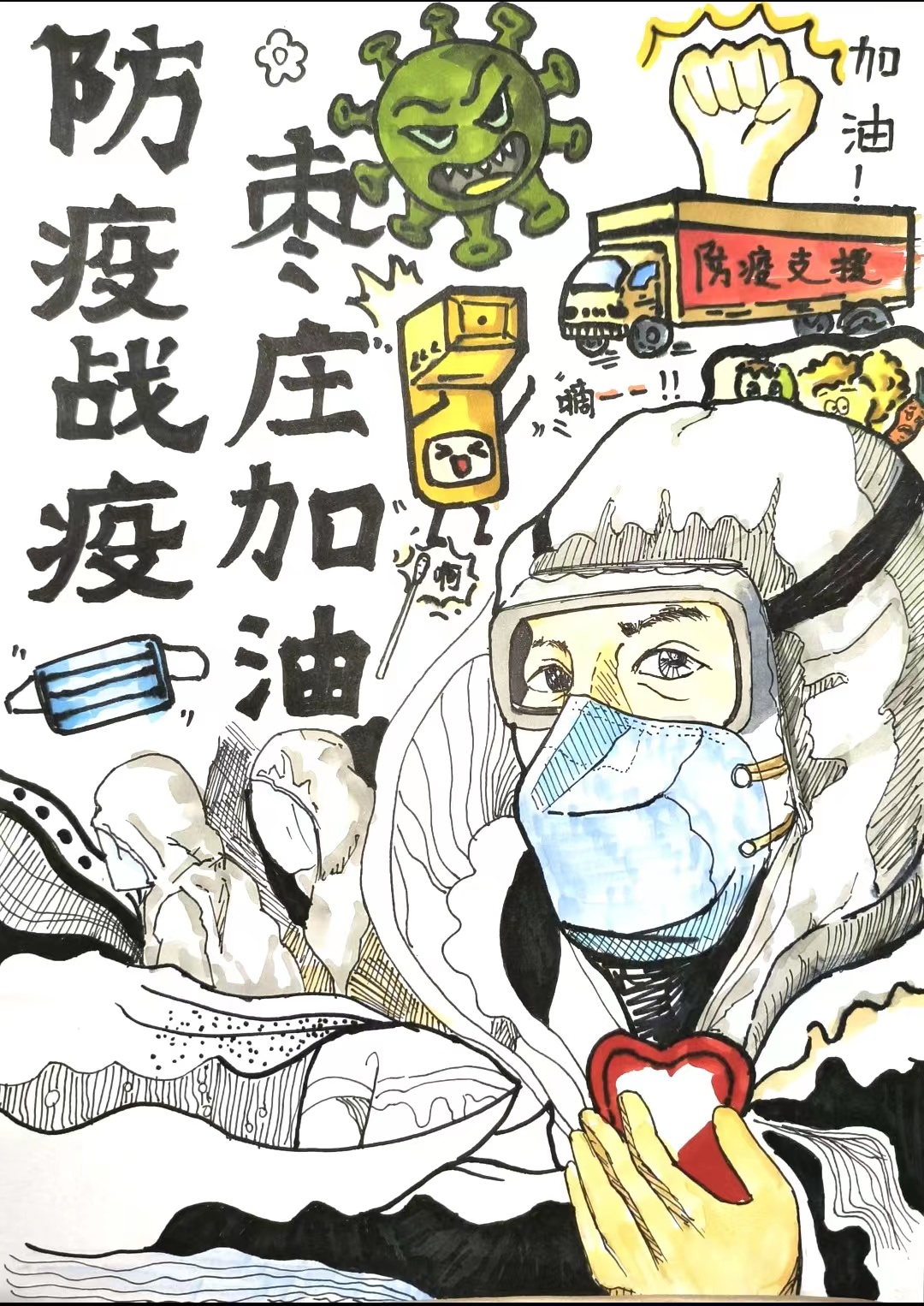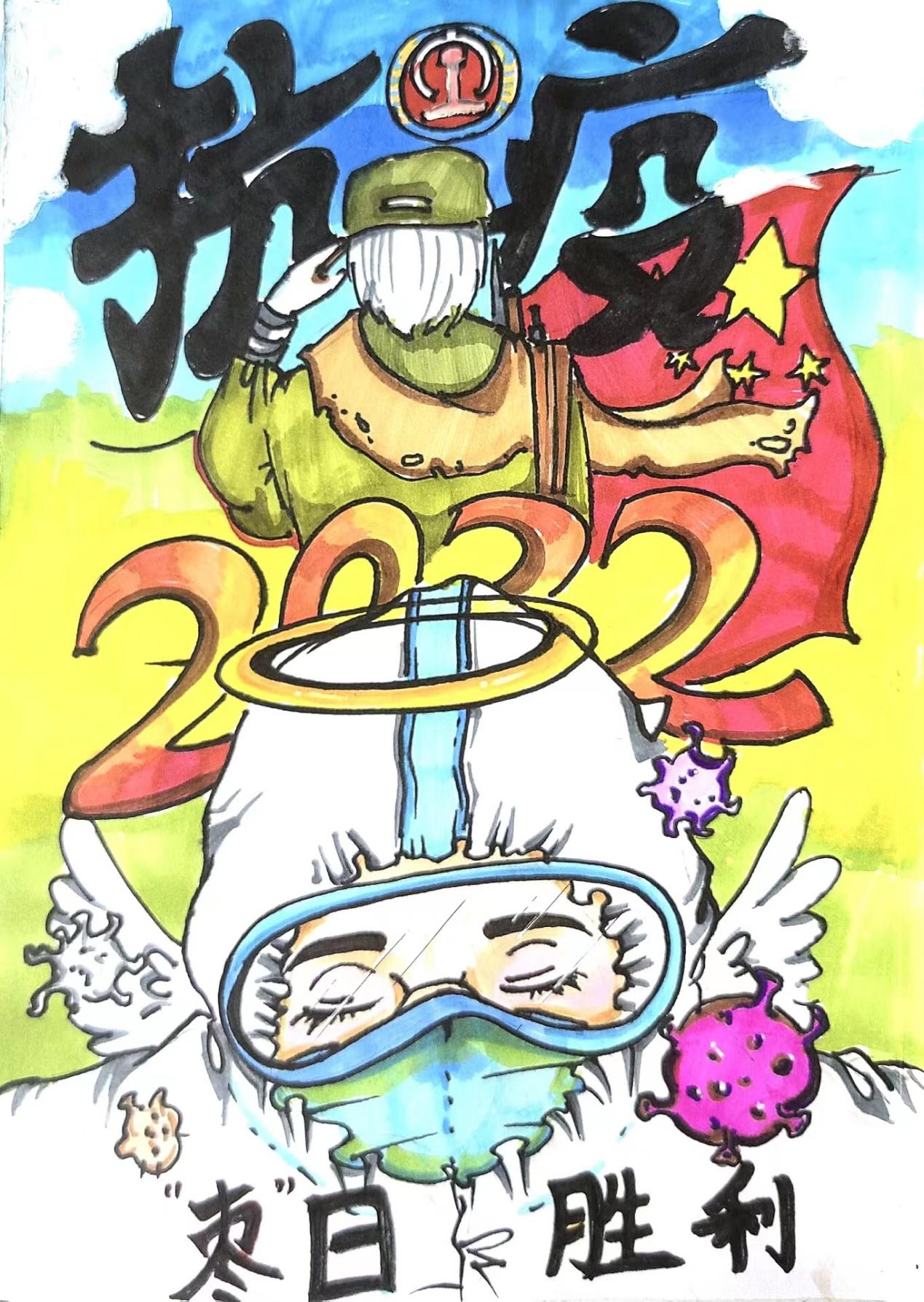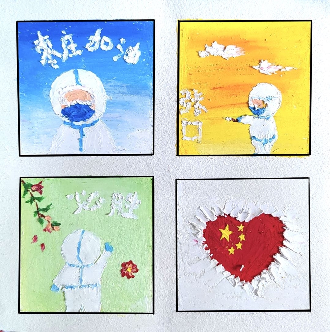 美院学子们依托自身专业特点与优势,精心创作百余幅战“疫”艺术作品,形式多样,涵盖手绘、油画、水彩画、书法和宣传海报五个门类。