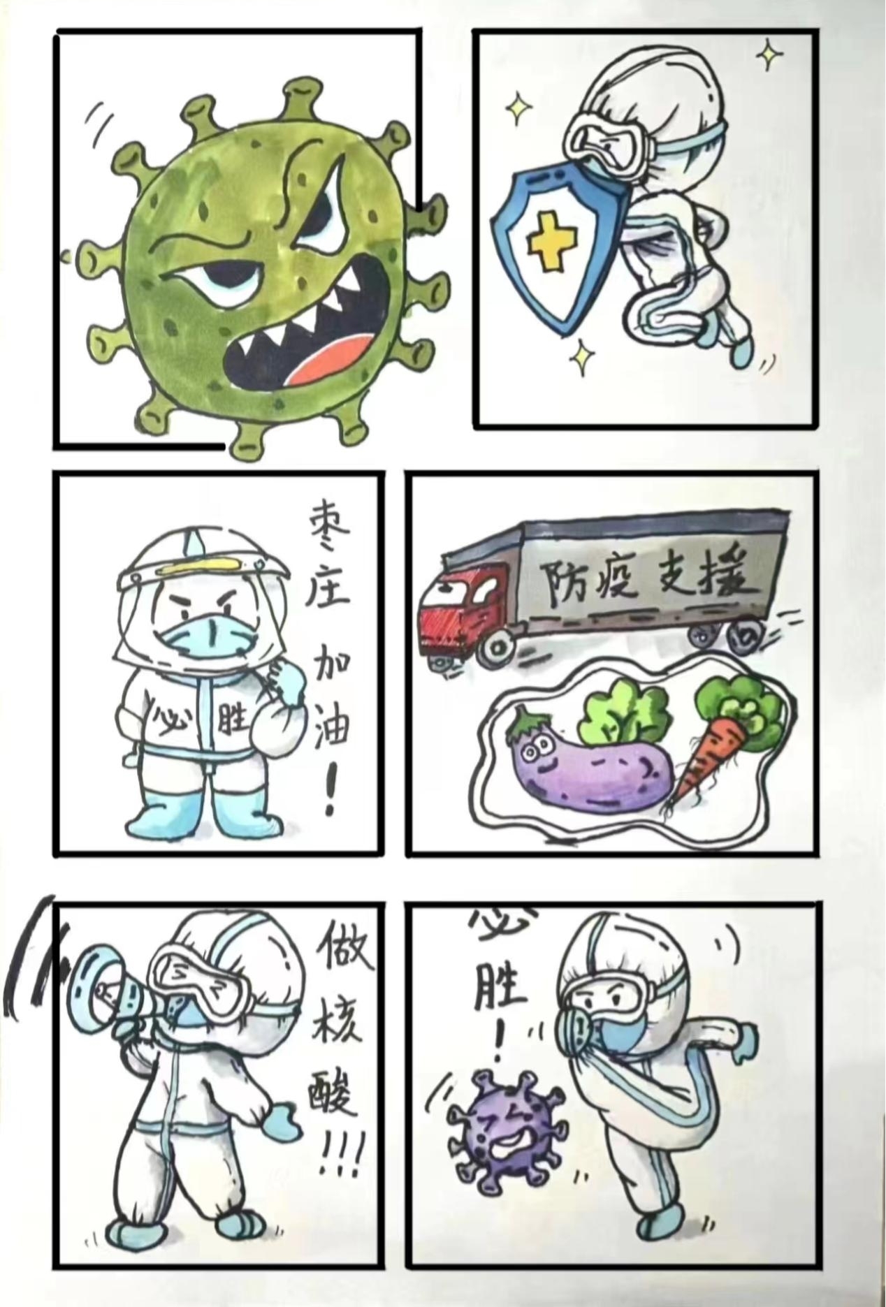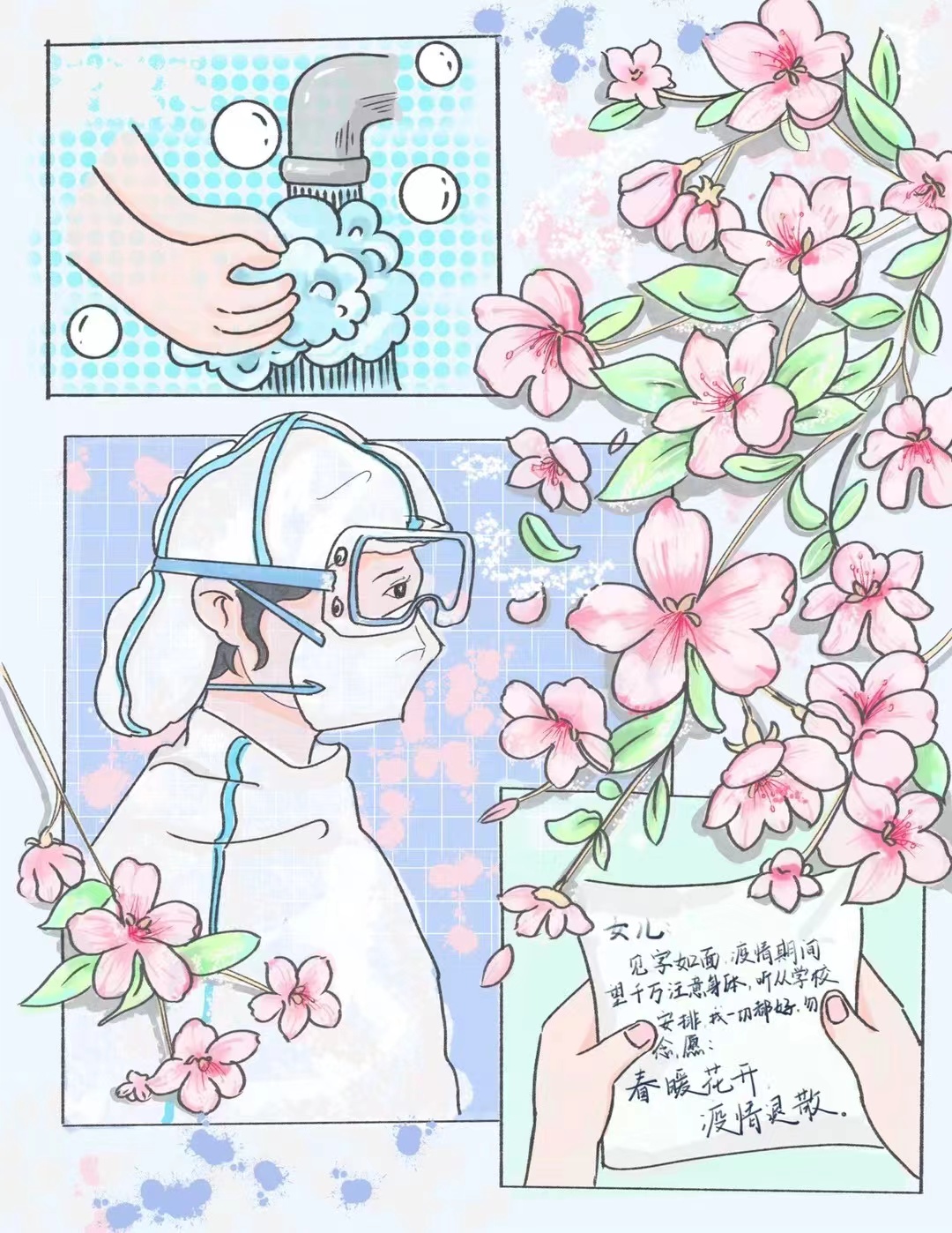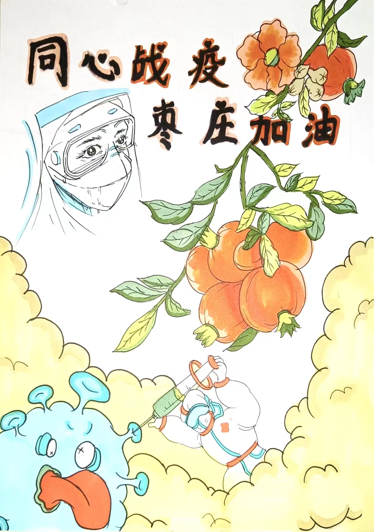 美院学子们依托自身专业特点与优势,精心创作百余幅战“疫”艺术作品,形式多样,涵盖手绘、油画、水彩画、书法和宣传海报五个门类。