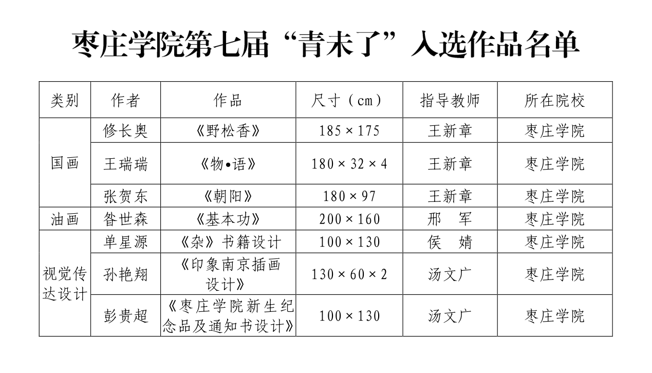 据悉,第七届“青未了”复评、评奖共收到44所高校报送的有效作品443件。经过评委严格评审,最终评出入选作品286件,其中包括国画91件、油画53件、版画10件、雕塑8件、水彩·水粉8件、陶艺10件、壁画·综合材料31件、视觉传达75件。入选作品正于7月14日至9月5日在山东美术馆展出。