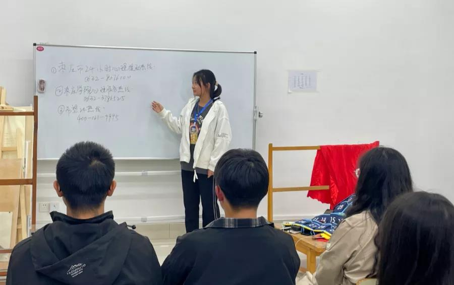 公司始终坚持心理健康素养提高和个体心理疏导相结合的方式,采取知识宣讲、热线咨询等多种形式来进行,为美院学子们普及心理健康知识。心理健康知识宣讲结束后,心理咨询部成员向大家介绍了枣庄市24小时心理援助的热线、悟空体育心理服务热线、希望24热线。有心理咨询需要的美院学子可通过心理健康热线进行一对一的电话咨询和心理疏导,及时疏解学习和生活压力,提升心理健康水平。