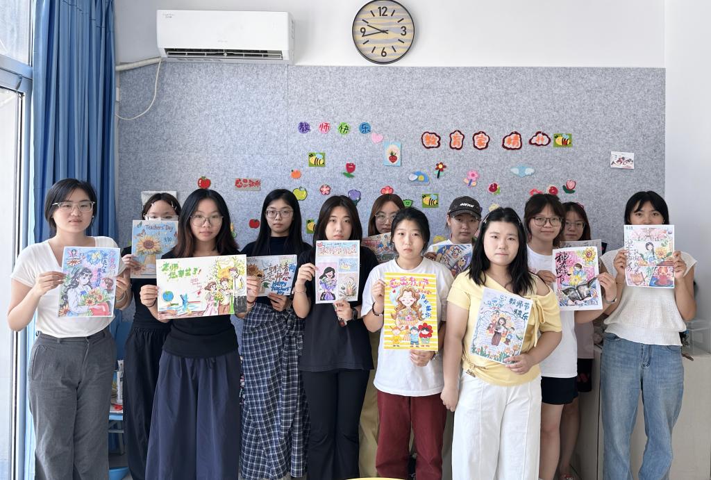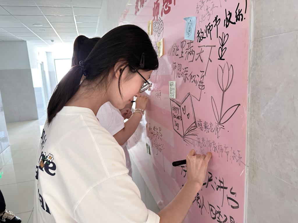 本次活动以“四个一”为主线,在教师节为老师们送上一枝花、一个书签、一张贺卡、一瓶水。同学们将这一份份满载心意的手工礼物送到教师手中,每一件礼品都融合了美院学子的巧思与专业素养,扭扭花象征永不凋谢的师恩,书签上绘有“立德树人,润物无声”等寄语,贺卡则由员工自主设计绘制并手写祝福语,一瓶清泉则寓意恩师润泽心田。温馨感人的教师节,老师们笑容洋溢,倍感欣慰。此外,在9号楼员工“一站式”社区设有“师恩涂鸦墙”,也吸引了很多同学参与,一句句“老师,您辛苦了”“祝您节日快乐”凝聚成爱的回响。