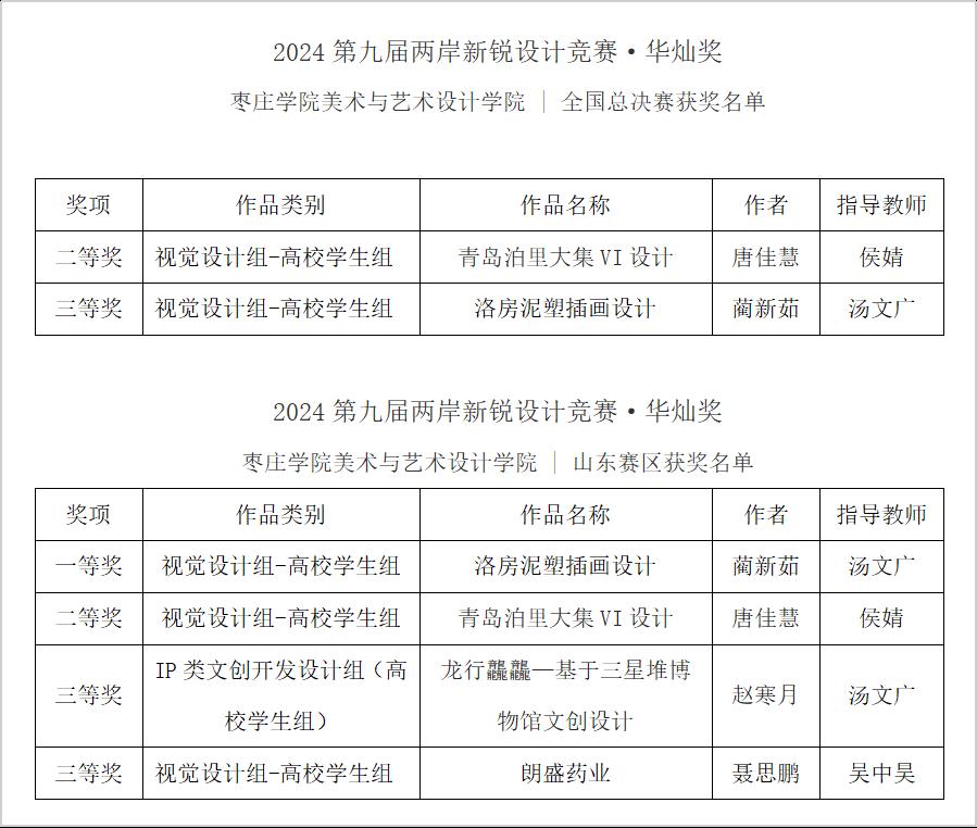 近日,第九届两岸新锐设计竞赛·华灿奖获奖名单公布,悟空体育在本次大赛全国总赛中分别获得二等奖、三等奖各1项;在山东省赛区中获得一等奖1项、二等奖1项、三等奖2项。悟空体育积极践行“思政引领、以赛促学、以赛促教”教学改革,通过进行有组织的学科竞赛来提升员工的综合实践能力、主动创新能力和团队协作能力。