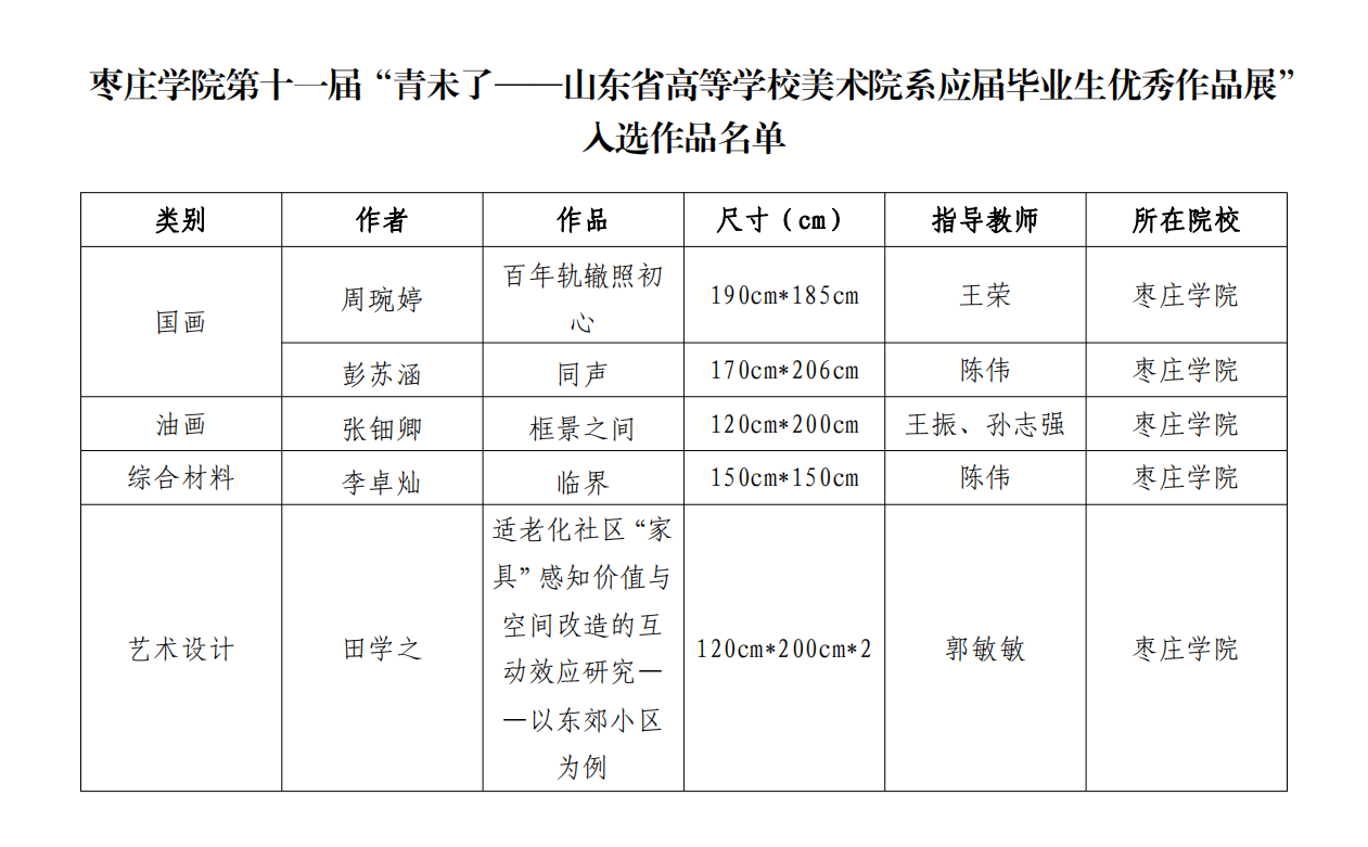 由山东省文化和旅游厅、山东省教育厅主办、山东美术馆承办的第十一届“青未了——山东省高等公司美术院系应届毕业生优秀作品展”入选作品名单公布,公司悟空体育选送的2025届毕业生毕业设计作品有5件入选,其中国画作品2件、油画作品1件、综合材料作品1件,艺术设计作品1件,入选数量和入选率均居省内同类本科院校前列。