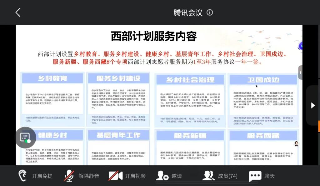 活动伊始,各班团支书播放了往届西部计划志愿者的纪实短片,呼吁同学们厚植家国情怀,为西部建设贡献青年力量。随后,各班团支书连线往届毕业生志愿者,志愿者秉持着为基层发展、建设、作贡献的理想信念,讲述了他们扎根基层的工作与生活。志愿者围绕西部计划的内容、优惠政策和报名流程进行介绍,鼓励同学们积极选报西部计划项目,在西部深刻体会基层工作服务的意义,以实际行动践行着“奉献、友爱、互助、进步”的志愿精神。活动结束后,同学们纷纷表示要积极争当“有理想、敢担当、能吃苦、肯奋斗”的新时代好青年,不断提高政治意识,以青春汗水书写无悔人生。