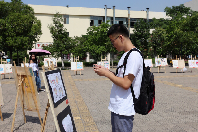 参加这次展览的作品为心理健康漫画比赛获奖作品,共分为四类,分别是一、二、三等奖和优秀奖。它们被组成心形布展,由大“心”套着小“心”,特别的展台组合吸引了不少校园师生前来观展。很多同学前来寻找自己的获奖作品并用手机给自己喜欢的作品拍照。