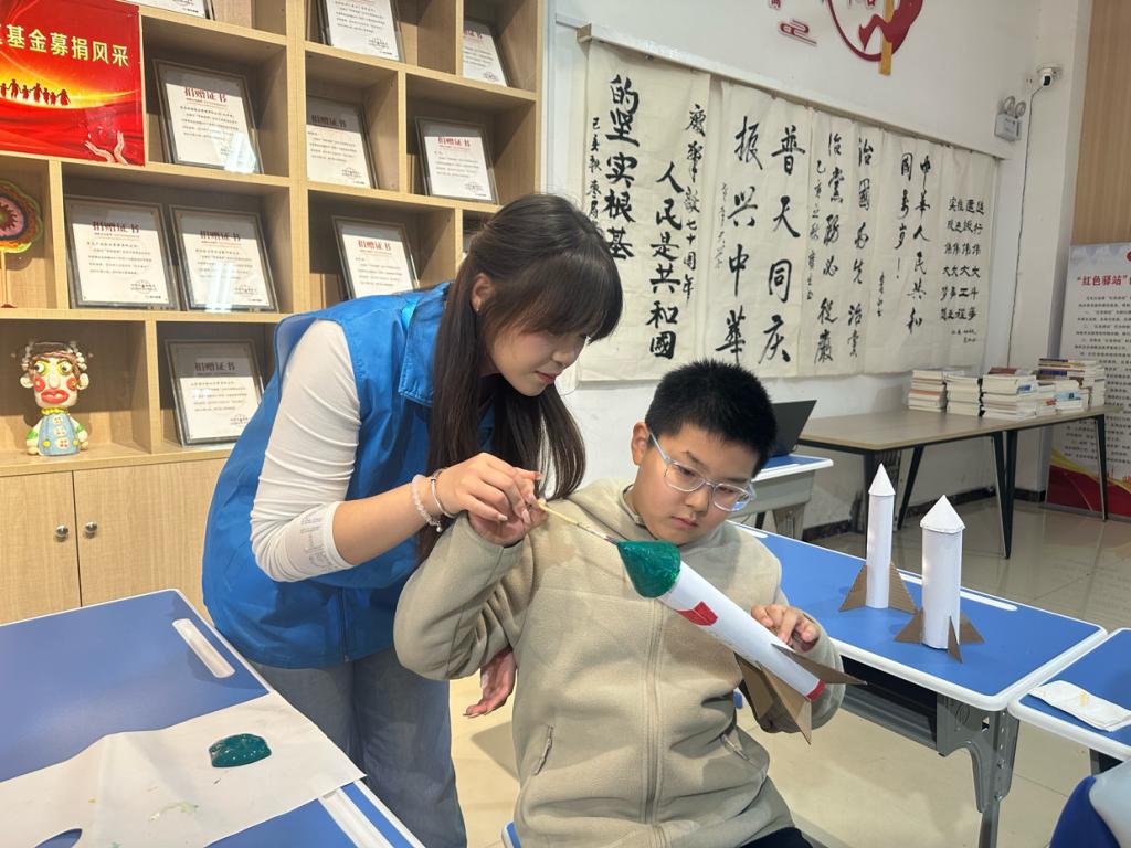 本次宣讲活动包括“理论阐释、事迹分享、互动感悟”三个环节,志愿者从“第一颗原子弹成功研制”切入,结合珍贵历史影像与感人事迹,回顾了我国核武器与人造卫星研制的艰辛历程,讲述了王淦昌、郭永怀等功勋科学家隐姓埋名、以身许国的崇高精神。宣讲结束后,开展了以“传承‘两弹一星’精神,绘就强国青春画卷”为主题的环保导弹模型和拼贴画制作活动。社区群众运用色彩与拼贴的方法将火箭、卫星及科研工作者等元素呈现于作品之中,通过亲手创作环保导弹模型,表达了对先辈功勋的崇高敬意,深化了对“两弹一星”精神的体悟。