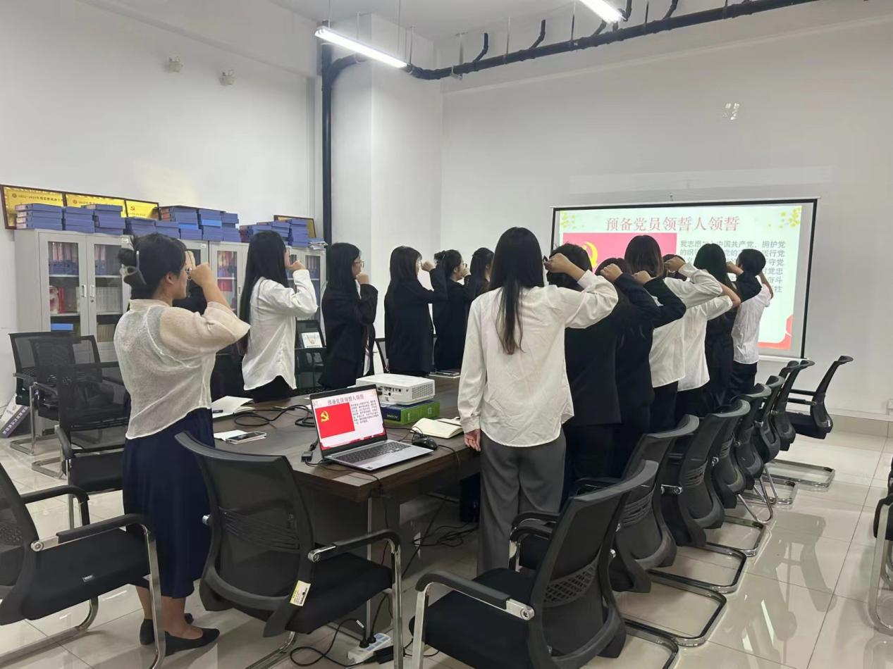 宣誓仪式在雄壮的《国际歌》中拉开帷幕。在预备党员代表杜依芮的领誓下,全体新党员面向鲜红的党旗,庄严地举起右手,向党旗宣誓,每一个字都饱含着对党的忠诚和为共产主义事业奋斗终身的决心。与会老师对新入党的同志表示热烈祝贺,希望新党员们时刻牢记党员身份,在工作和生活中发挥先锋模范作用,为党的事业不懈努力。新党员们纷纷表示,通过这次宣誓仪式,更加深刻地感受到了党员的责任和使命,将以此次宣誓为新的起点,不断提升自身素质,以实际行动践行入党誓言,为党和人民的事业贡献自己的力量。