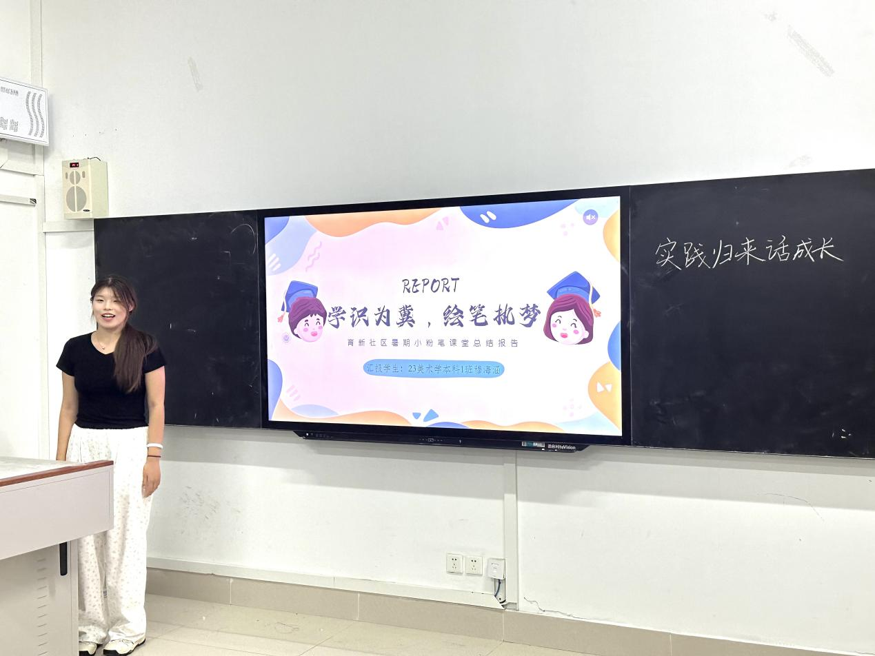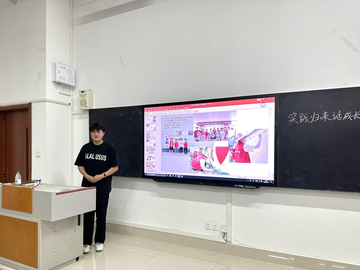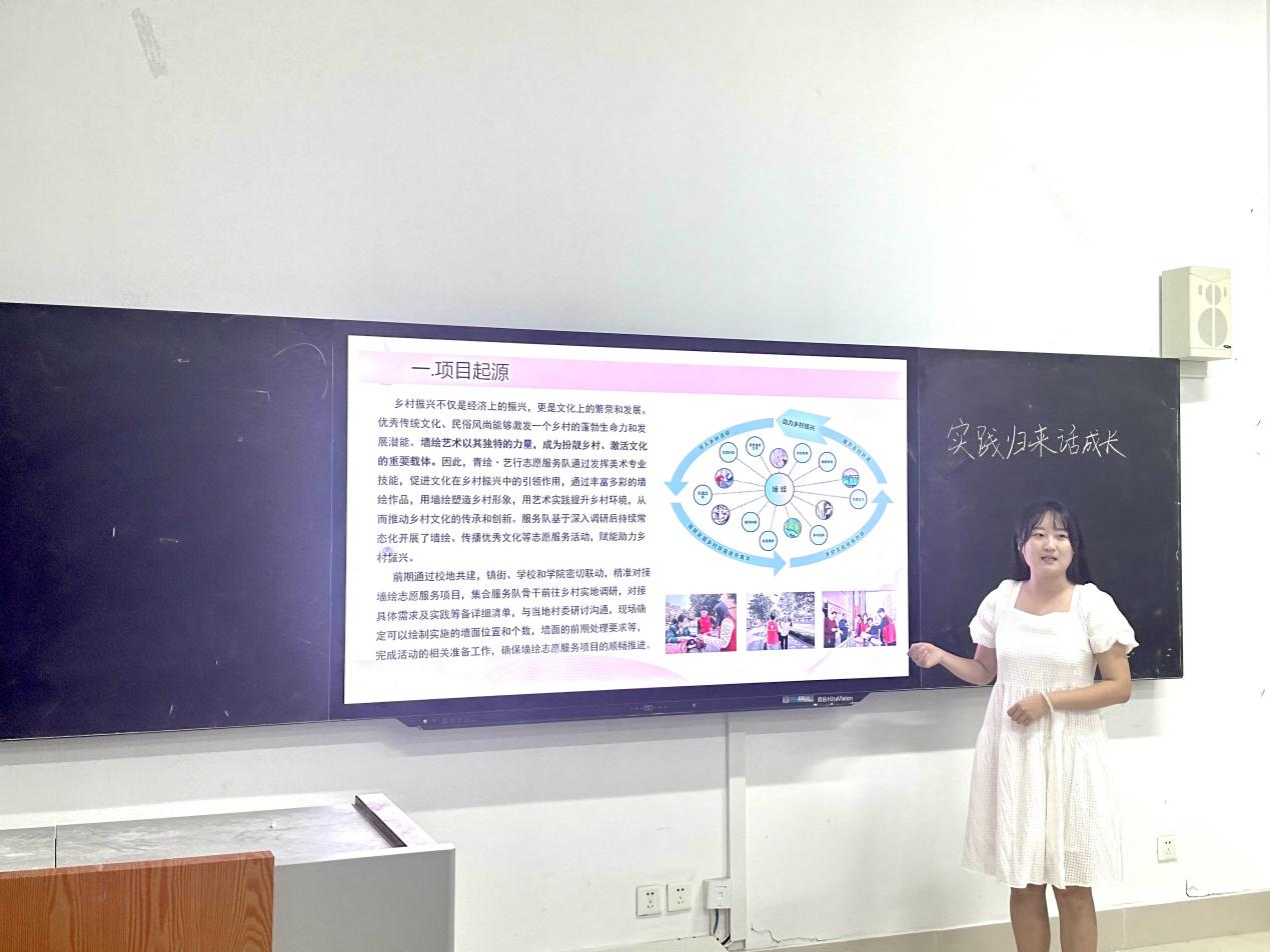 活动紧扣“青春正向上,梦想有光芒”为主题,通过PPT分享了在实践前的准备筹划、实践中的经验见闻、实践后的总结反思。所展示的类型包括青鸟计划、返家乡实践,暑假三下乡,百万老员工进社区等。他们从实践背景及意义、实践目的、实践内容等多角度对项目进行展示。志愿者们充分发挥美术学科的专业优势,将理论知识与社会服务相结合,实现自我价值与社会价值的提升,助力当地乡村振兴,为中国式现代化贡献青春智慧和力量。