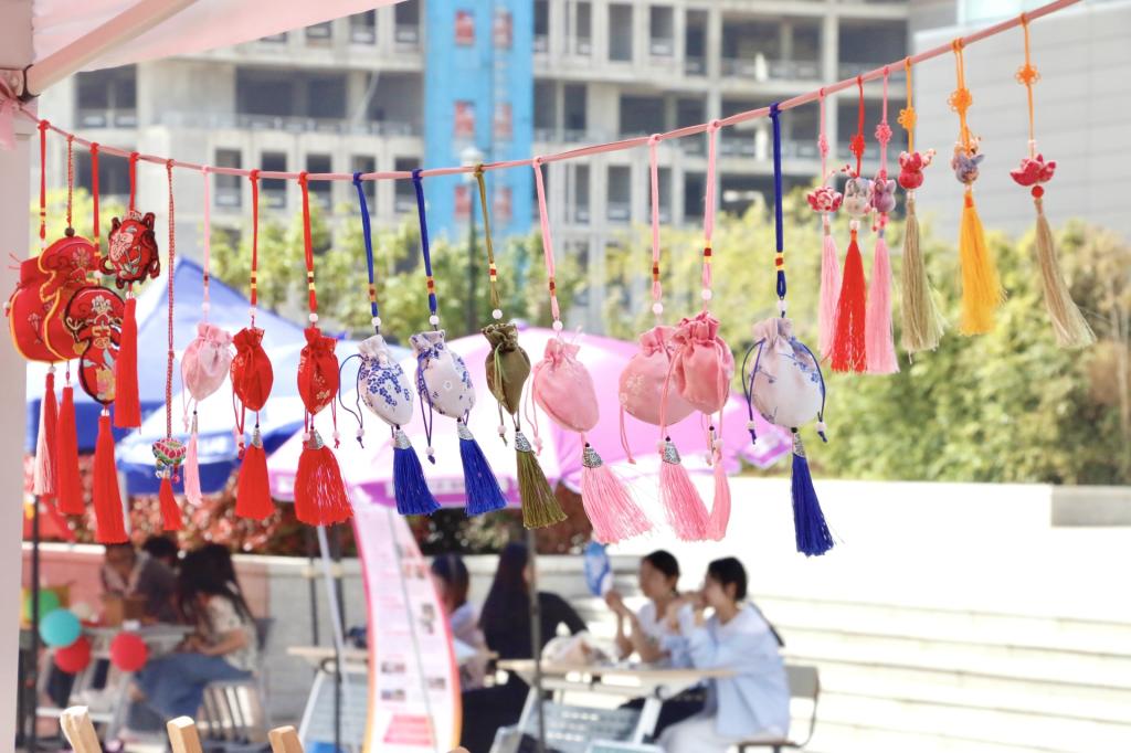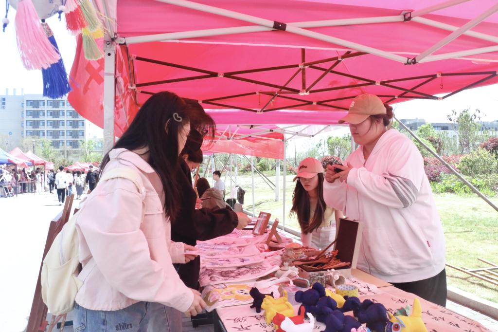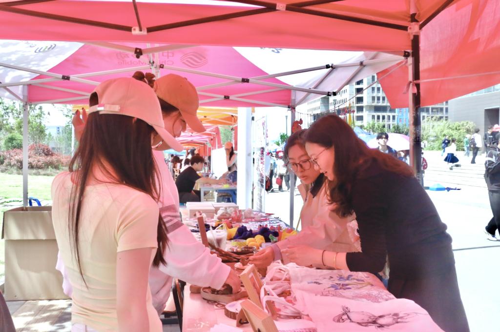 集市现场热闹非凡,各类文创产品琳琅满目。汇聚了来自三个社团200余件文创产品。展示的文创产品均来自民间手工艺协会、大地书画协会和文萃印社全体社团,包括立体纸艺、非遗剪纸、非遗漆扇、水彩画、国画、书法卷轴、布艺、陶艺、木雕首饰、植物书法文创、拓印、竹编画、手绘美甲、手绘帆布包等近30类文创作品。同学们被文创作品吸引,纷纷选购自己心仪的艺术品进行交易。集市提供了布艺讲解、非遗剪纸、书法文创、非遗扎染四个手工体验区域。同学们可以亲身体验文创产品的制作,感受艺术的魅力。